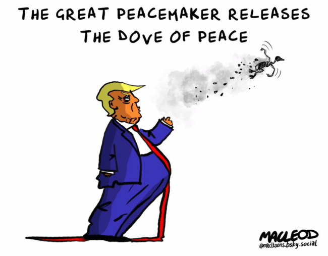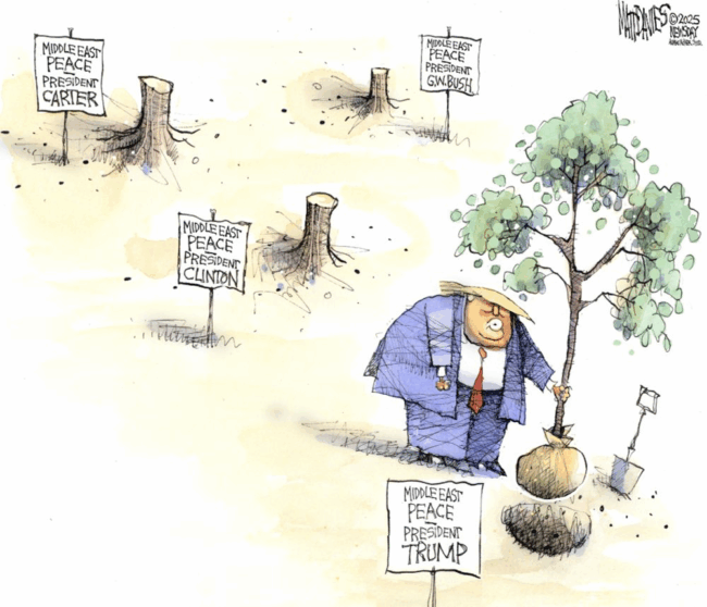 Rob Rogers – Trump is bragging about a middle east peace deal that took way too long (Biden is at fault too) in the midst of a genocide in Gaza. Also, it does not appear that Hamas and Israel are fully on board to end hostilities. #Trump #MiddleEastPeace #Israel #Palestine #Gaza #Hamas #peace