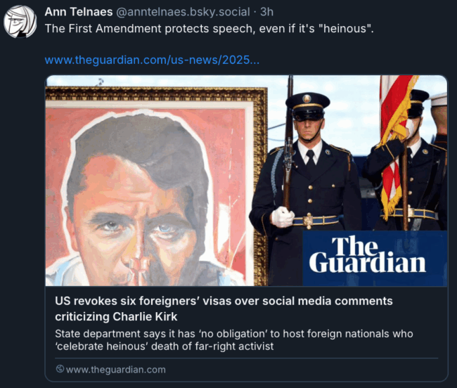- Free speech protected Charlie Kirk while he said, hideous things about muslims, minorities, immigrants, and particularly Black women. But it doesn’t protect people who say that he was monster for saying such things.