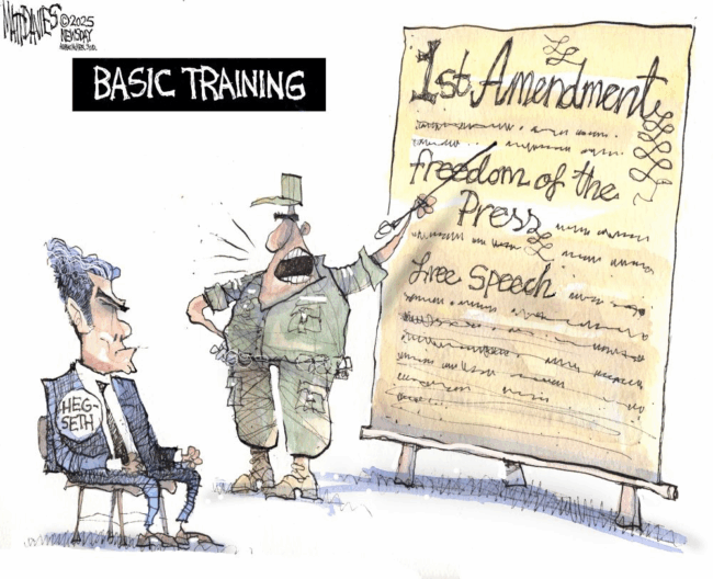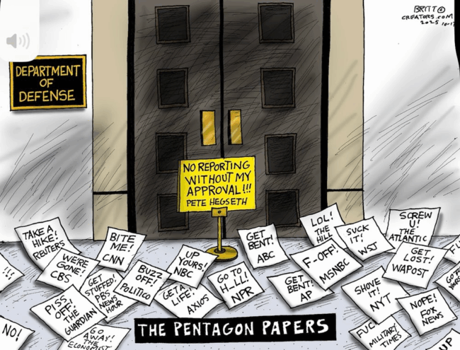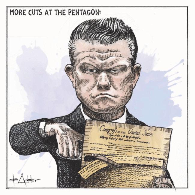 Rob Rogers – Pete Hegseth has instituted a policy that would prohibit journalists from accessing or soliciting information from the Pentagon that he hasn’t pre-approved. Thankfully, most news organizations are not playing along.