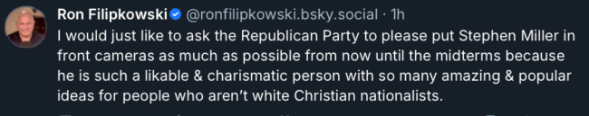 …to defend and advance President Trump’s agenda” … of starving millions of Americans. Got it.