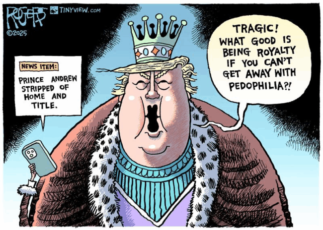 Rob RogersTrump said he feels “very badly” for the Royal familybut he has yet to express any sympathy for Virginia Giuffre or any of Jeffrey Epstein’s other victims. #JeffreyEpstein #PrinceAndrew #Trump #pedophile #rape #SexTrafficking #criminal #royalty #king