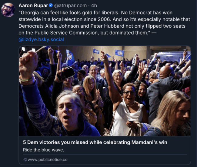 Briefly (as you most probably already know because it would be almost impossible to have missed it), Mamdani won NY, and Virginia voters also turned sharply left. Sherril won New Jersey with 56%, and Prop 50 passes in CA. All this and more is well worth celebrating.