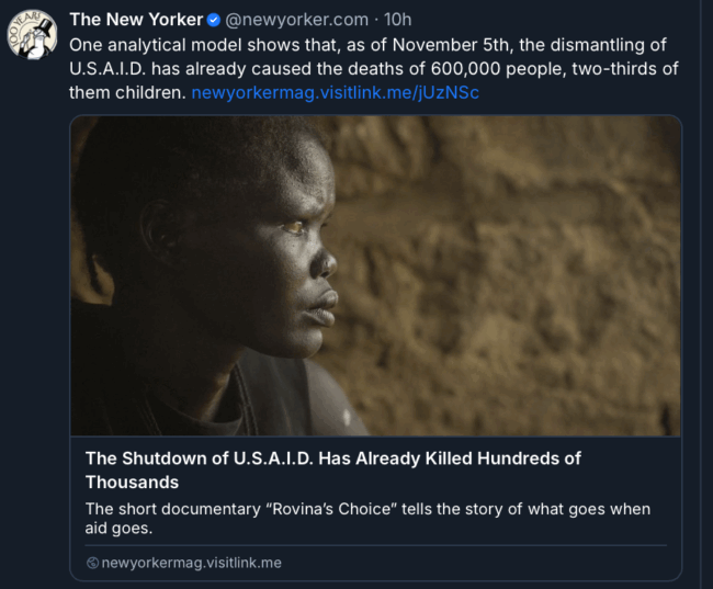 • Shutting down USAID is a decision that will ultimately have a preventable death toll on the same order of magnitude as the Holocaust. I wish that was an exaggeration.