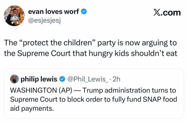 Trump ordered to make SNAP payments and admonished by a judge for using hunger as a weapon and defying a court order.