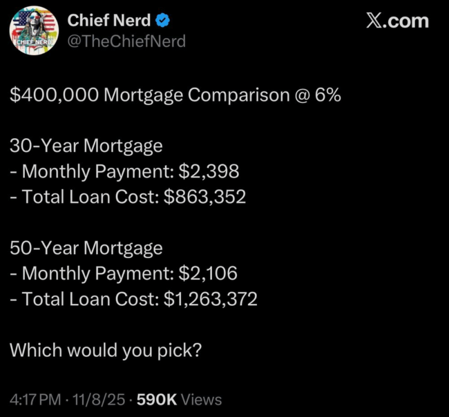 With this new 50 year mortgage, the plan is to make us debt slaves for life – you will end up paying his banker friends hundreds of thousands more in interest on mortgages while they own a piece of your home until you die.