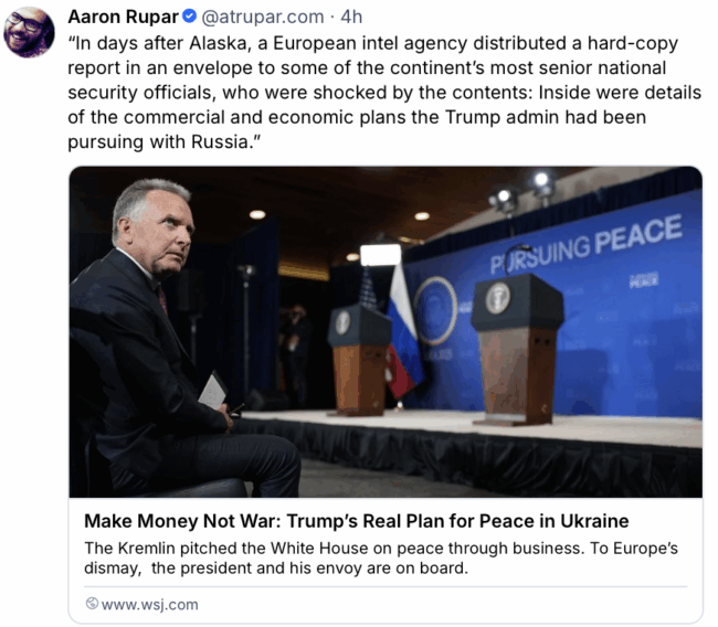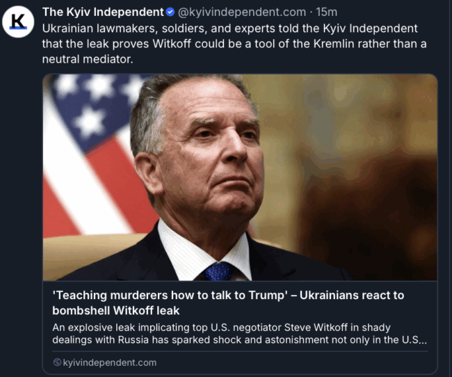 - Quote: “In one of the conversations leaked by Bloomberg on Nov. 25, two Kremlin aides discuss having Witkoff falsely present a Russian peace proposal as a U.S. initiative. The leak appeared to confirm recent media reports that Trump’s peace plan unveiled on Nov. 20 was actually a collection of Russian demands. It shows that Witkoff effectively became the Kremlin’s key to the White House and, in this case, is acting more as a partner of Russia than as a neutral negotiator,” Volodymyr Ariev, a lawmaker for the European Solidarity party, told the Kyiv Independent.