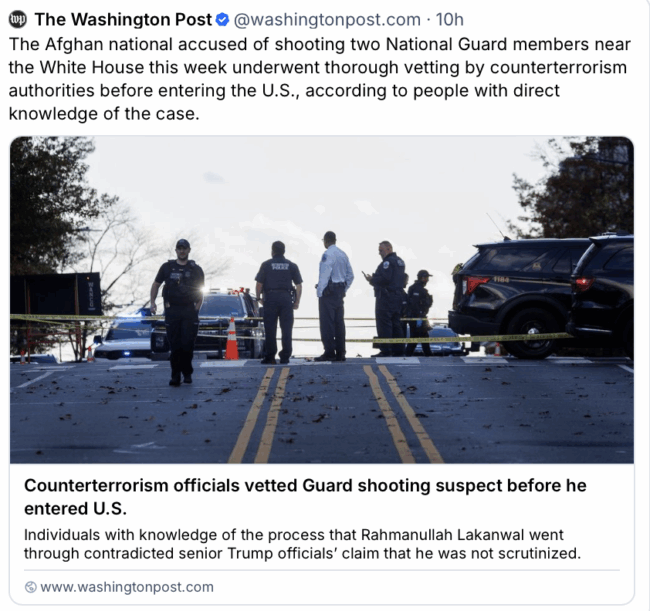 Trump granted the man asylum this spring. Trump agreed with the program that brought him here in 2021. There was full vetting. Trump’s DC op is why this happened. Now it’s being used to end all immigration from nonwhite countries. And undo the Biden presidency.