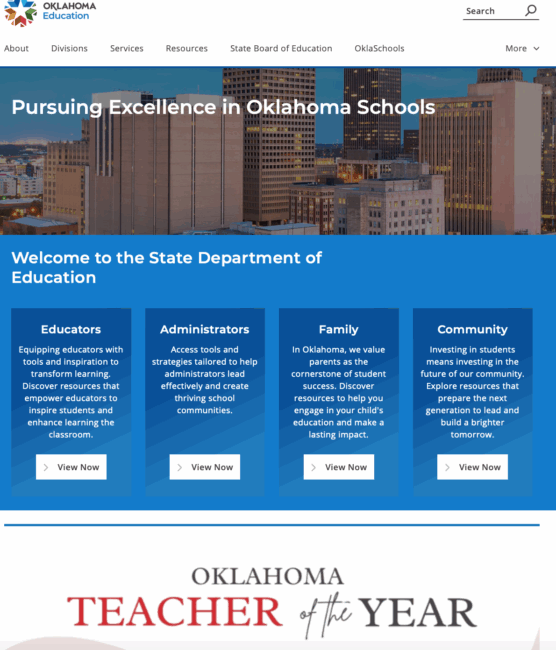 If you surf on over the Oklahoma Education now, what you will discover in that finally there is some common sense recognition that you fall into one of four categories: Educators, Administrators, Family, Community. Just click your category and you are presented with a detailed list of links just for you so that you can rapidly dive into stuff that is real immediate interest to you – excellent stuff.