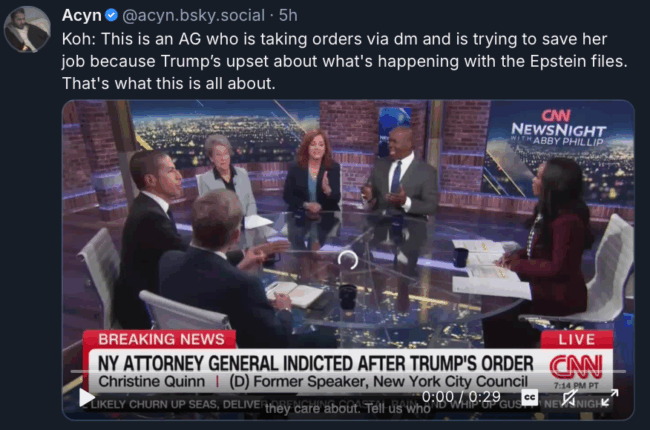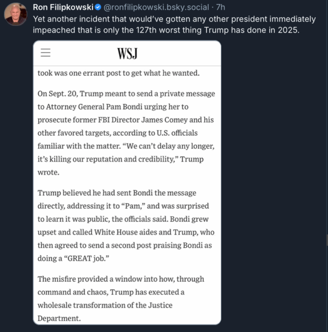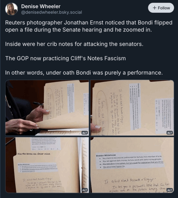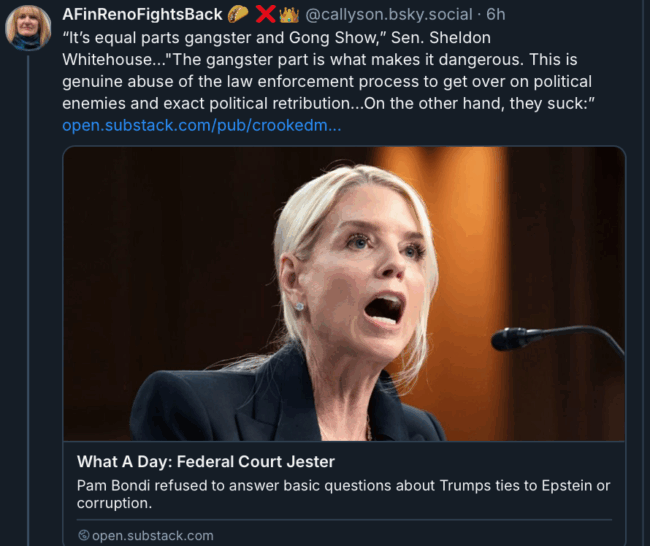 - Quote from a follow up tweet: “So Bondi plans her congressional hearings by bringing up dirt on the senators who questioned her rather than answering the questions. This is the lying schemer that is running the DOJ.“