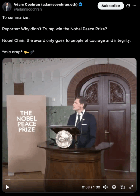 This past week has been a true delight and joy to behold. He deeply desires the peace prize because Obama got it and so he wants one as well. He attempted to orchestrate a Gaza deal to get it and not because he cares two hoots for anybody else but himself. However, the independence and integrity of the committee in Norway prevailed. They will be neither bullied nor bought – “No” means “No”.
