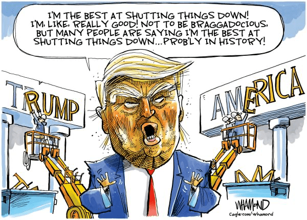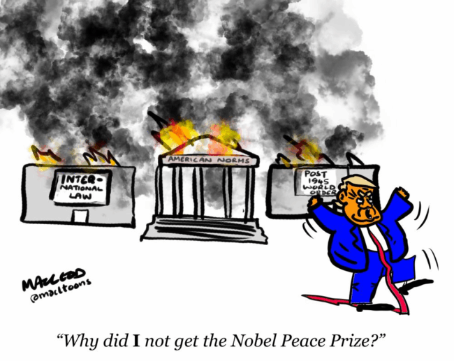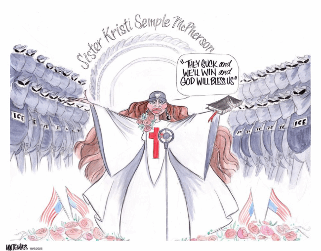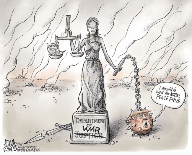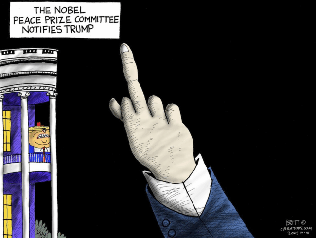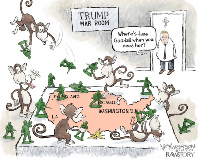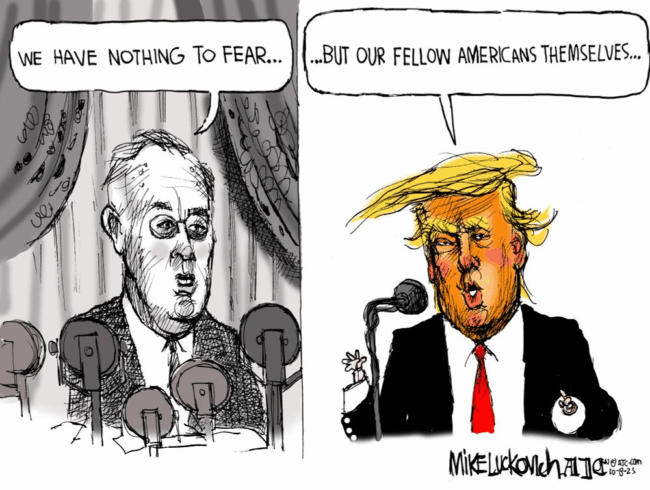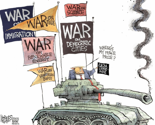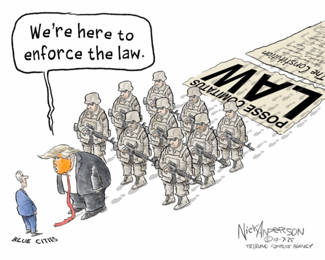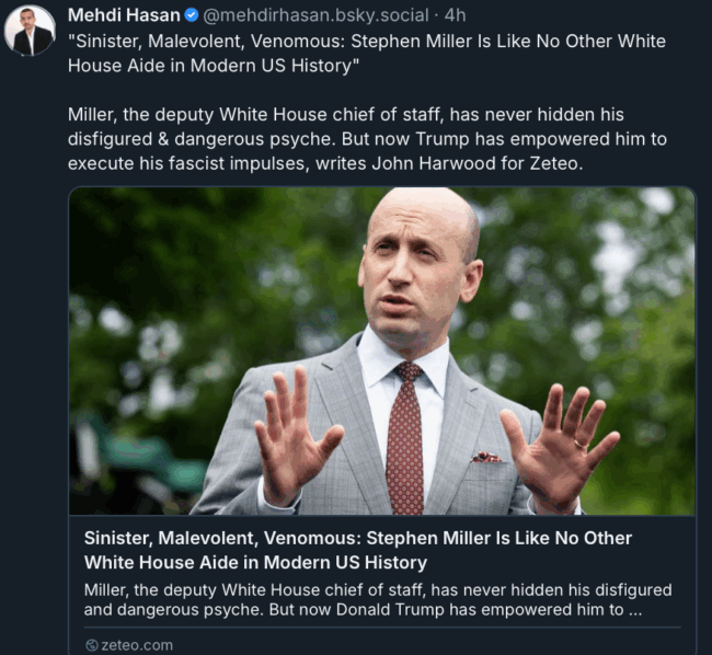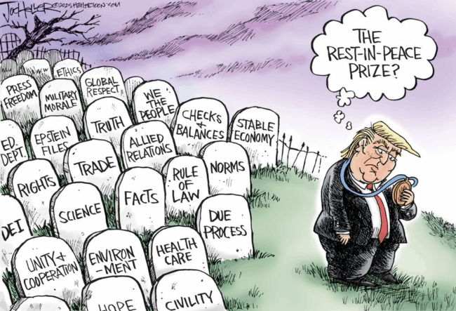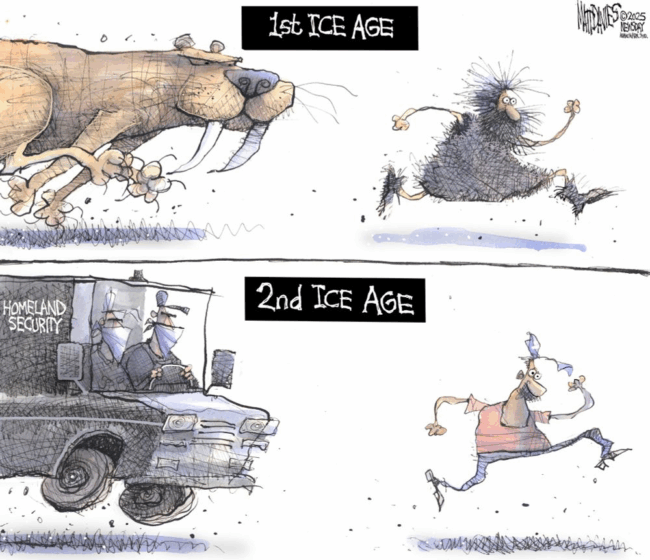 Lalo Alcaraz – “Shadow President and man who keeps the mass deportation trains running on time, Stephen Miller, is just fed up with being accurately labeled a fascist and a Nazi. Do not mock his looks, or his height, or the fact that he IS A FASCIST AND A NAZI.“