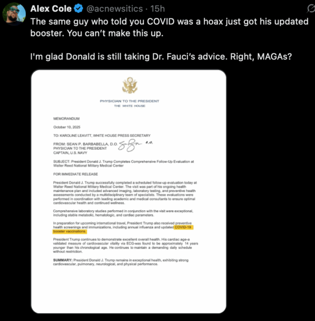 You-know-who might have embraced an anti-vaccine nut and put RFK Jnr in charge of US Health, but when it comes to himself, he wants the stuff that actually works …