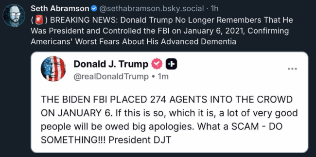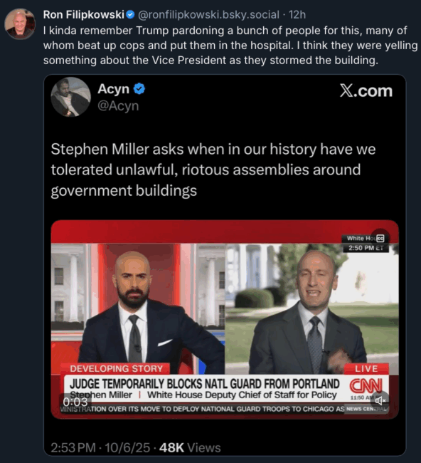 Miller asks “When have we ever tolerated protests“, and so Ron has to once again roll out a reminder that Trump has happily pardoned the Jan 6 mob as a reward for being his mob, his violent rioters …