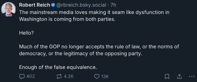 - Quote: “During its long descent into extremism, the GOP has consistently deflected criticism by citing past Democratic actions and claiming “both sides do it.” They don’t. And the falsity of their false equivalencies has never been so easy to see.“