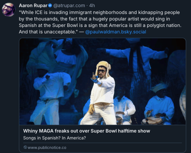 Rob Rogers – “When the NFL announced that Bad Bunny will be the halftime performer at Super Bowl LX, the white nationalist MAGA crowd lost their minds. I hope Bad Bunny takes a knee too. #BadBunny #MAGA #SuperBowlLX #Trump #NFL“