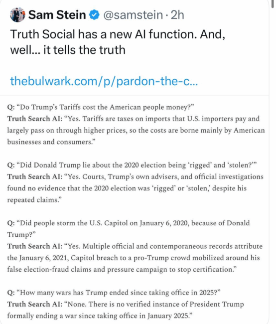 They turned on an AI for Truth Social and have been shocked to discover that it insists on telling the truth …
