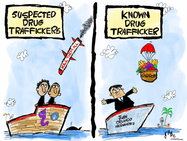 Trump allegedly cares so much about keeping illegal drugs out of America that he’s willing to commit murder, yet, he pardons a man responsible for importing 400 tons of cocaine to this country. And Biden is mentally impaired?!