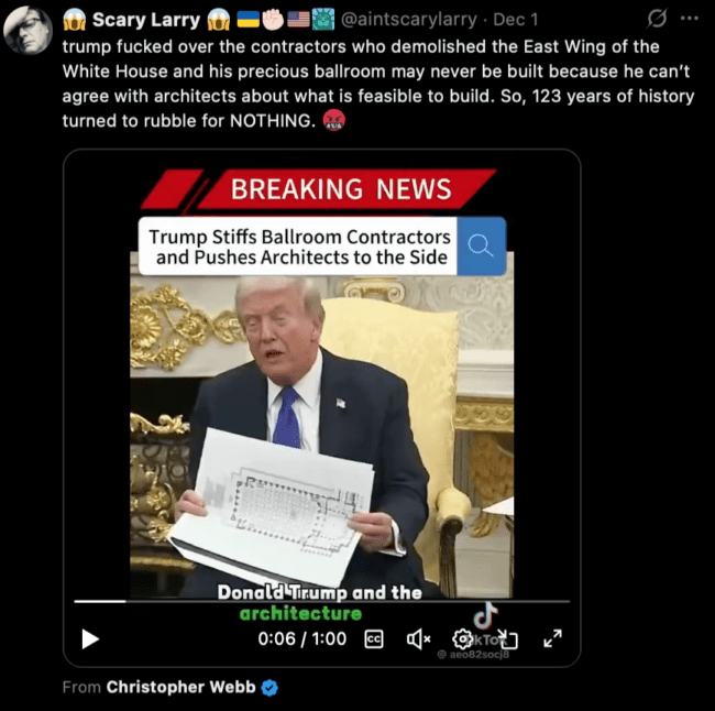As for the work on that ballroom, well guess who has stiffed the contractors …
