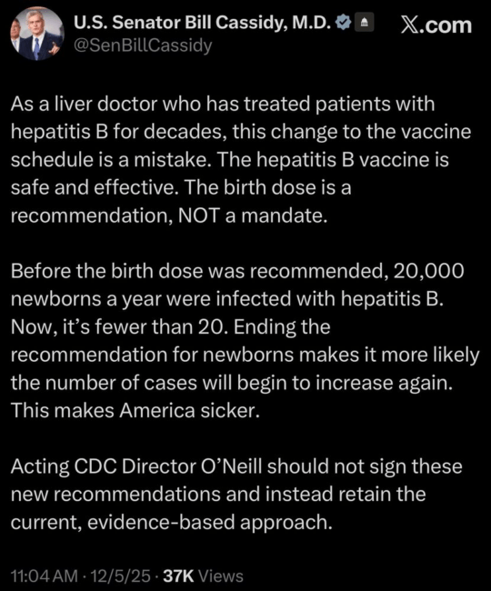 Here is Bill Cassidy doing performative concern, and remember, he had the deciding vote to appoint RFK Jnr, and was warned what RFK Jnr would do, is a qualified medical doctor who should know better, and yet he still voted for him, and so here we are now …
