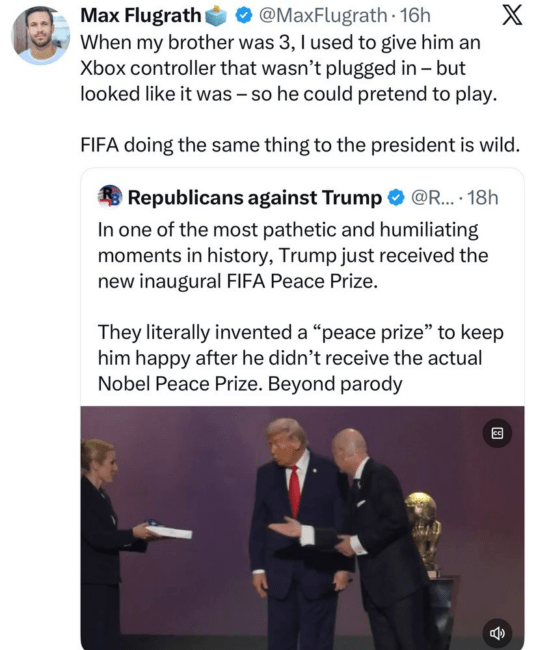 Meanwhile, I’m setting the betting line that there will now be at least 25 different organizations that present Trump with a peace prize in 2026.
