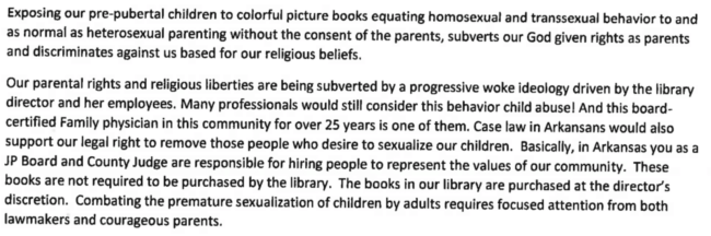On behalf of the Quorum Court she wrote a letter to the library board demanding book censorship …