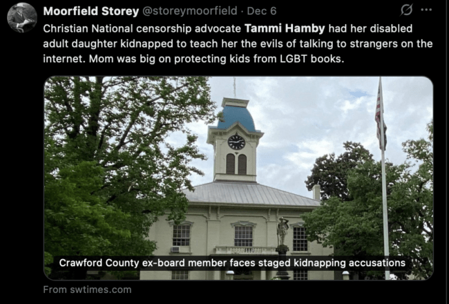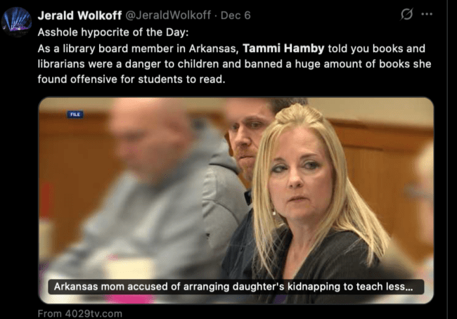 The Hambys waged war on librarians for shelving books about LGBTQ families, calling it “child abuse,” even as they orchestrated a literal kidnapping of their own daughter. They demanded censorship in the name of protecting minors, then organized the physical restraining of someone under their own care. There’s Christian hypocrisy, and then there’s whatever the hell the Hambys have been doing. The gap between their morality and their actions is practically the Grand Canyon.